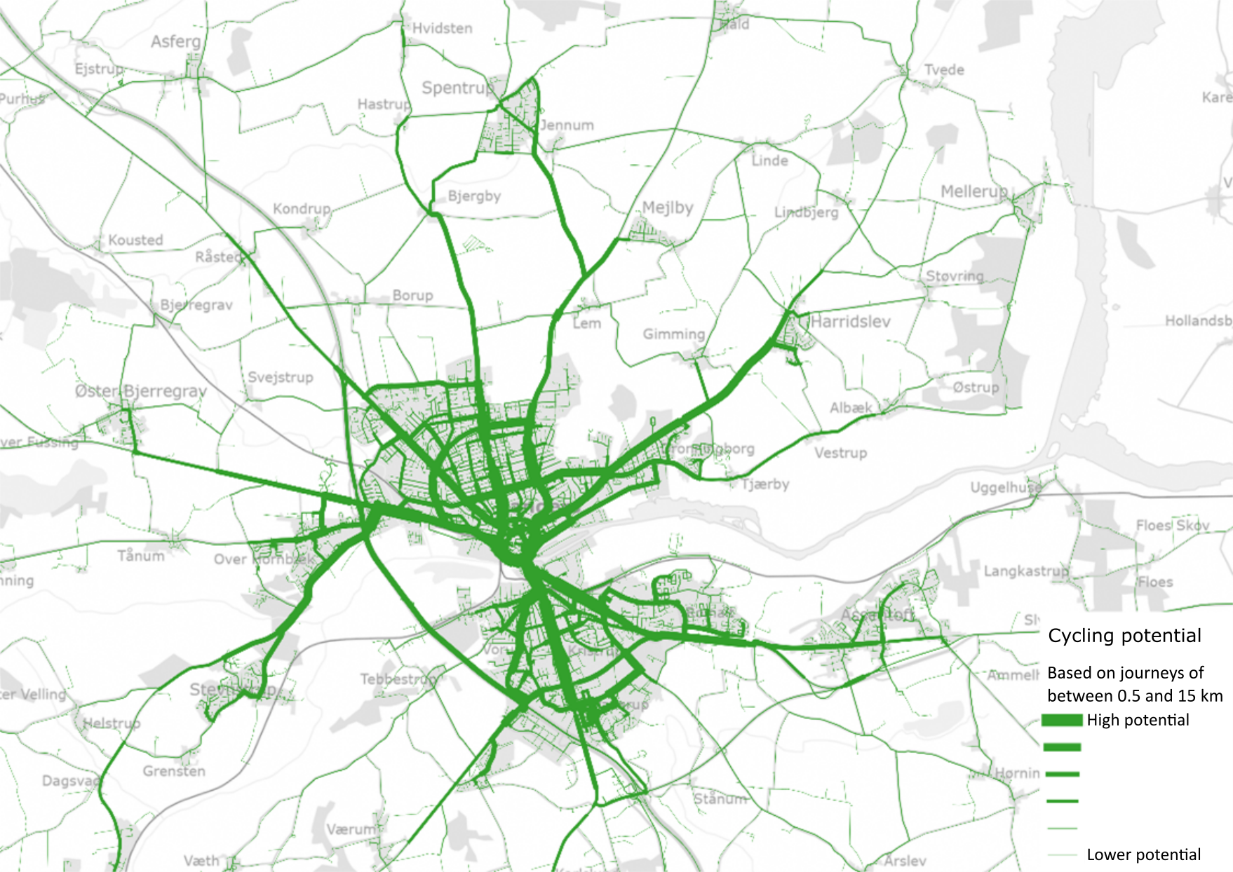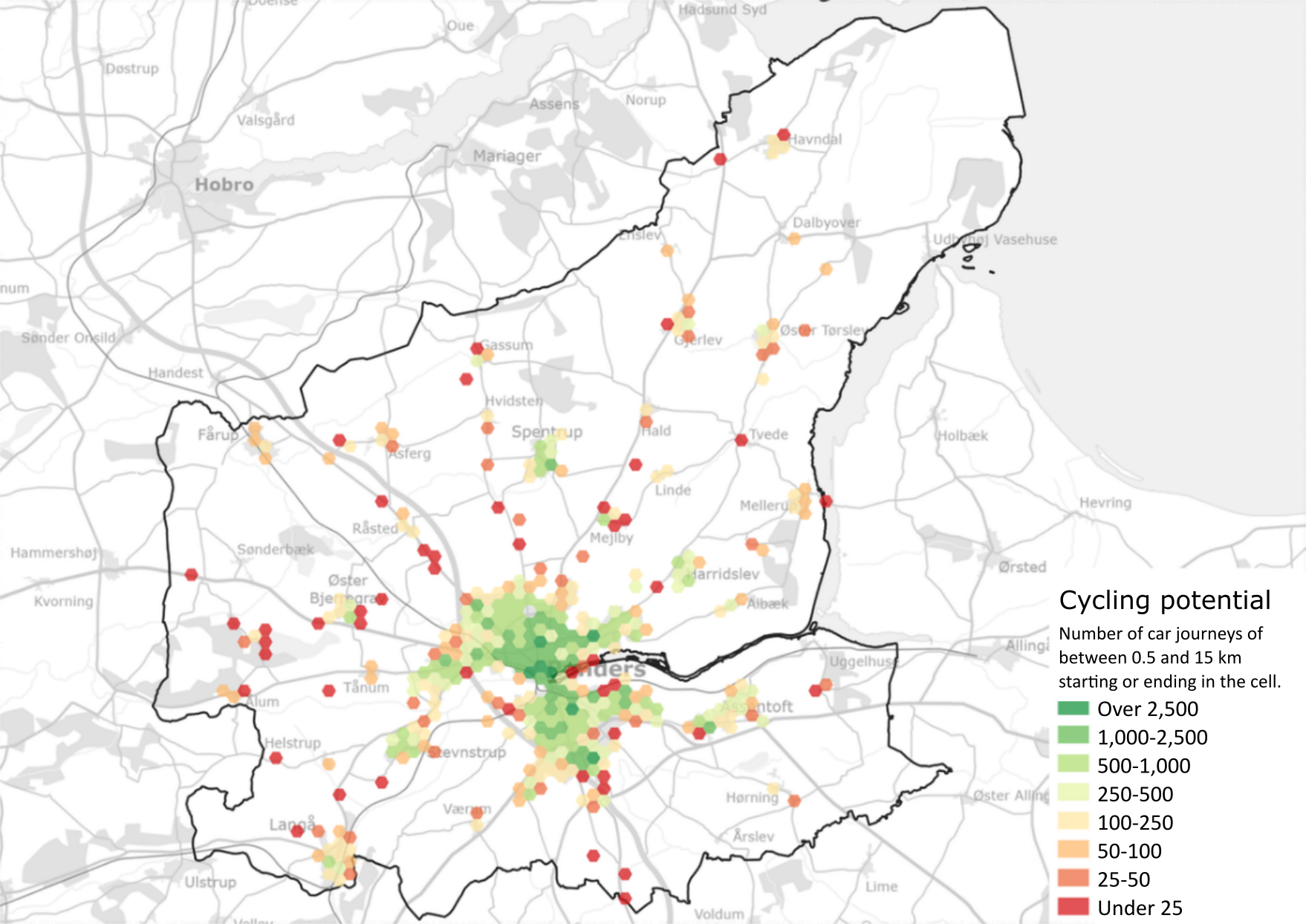 Every year, Danish municipalities make major cycling infrastructure investment decisions with the aim of persuading more people to swap the car for the bicycle. Here, a solid foundation of data is crucial to targeting investment where it will add most value. In this context, GPS data from car travel can be used to calculate and map out where the greatest cycling potential lies.