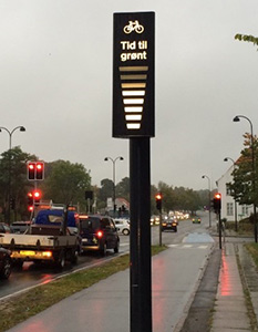 Aarhus has carried out pilot studies of dynamic signals at intersections. The signal is activated and informs the cyclist that there is a large motor vehicle in the right- turn lane. In this case it’s the cyclist that receives the warning in contrast to the system described above where the motorist/ lorry driver gets the warning.